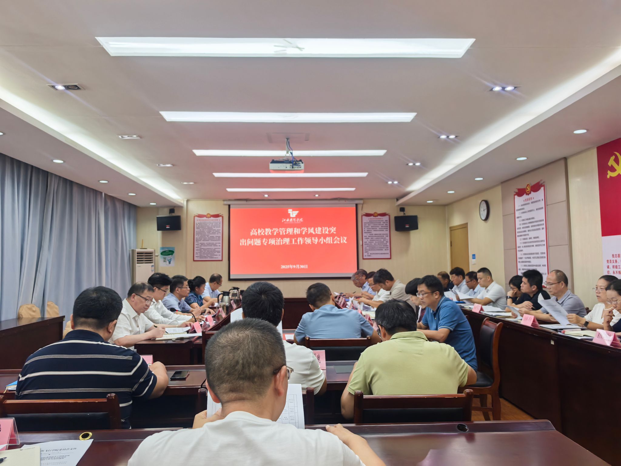 9月30日,学校在综合楼四楼会议室召开高校教学管理和学风建设突出问题专项治理工作领导小组会议。校党委书记陈震、校长龙国英出席会议并讲话,副校长欧阳剑雄主持会议,校领导张海涛、郭军华出席会议。党政办公室、党委组织部、党委宣传部、党委统一战线工作部、人事处、学生工作处、教务处、科研处、校团委主要负责同志,各二级学院党政主要负责人参加会议。