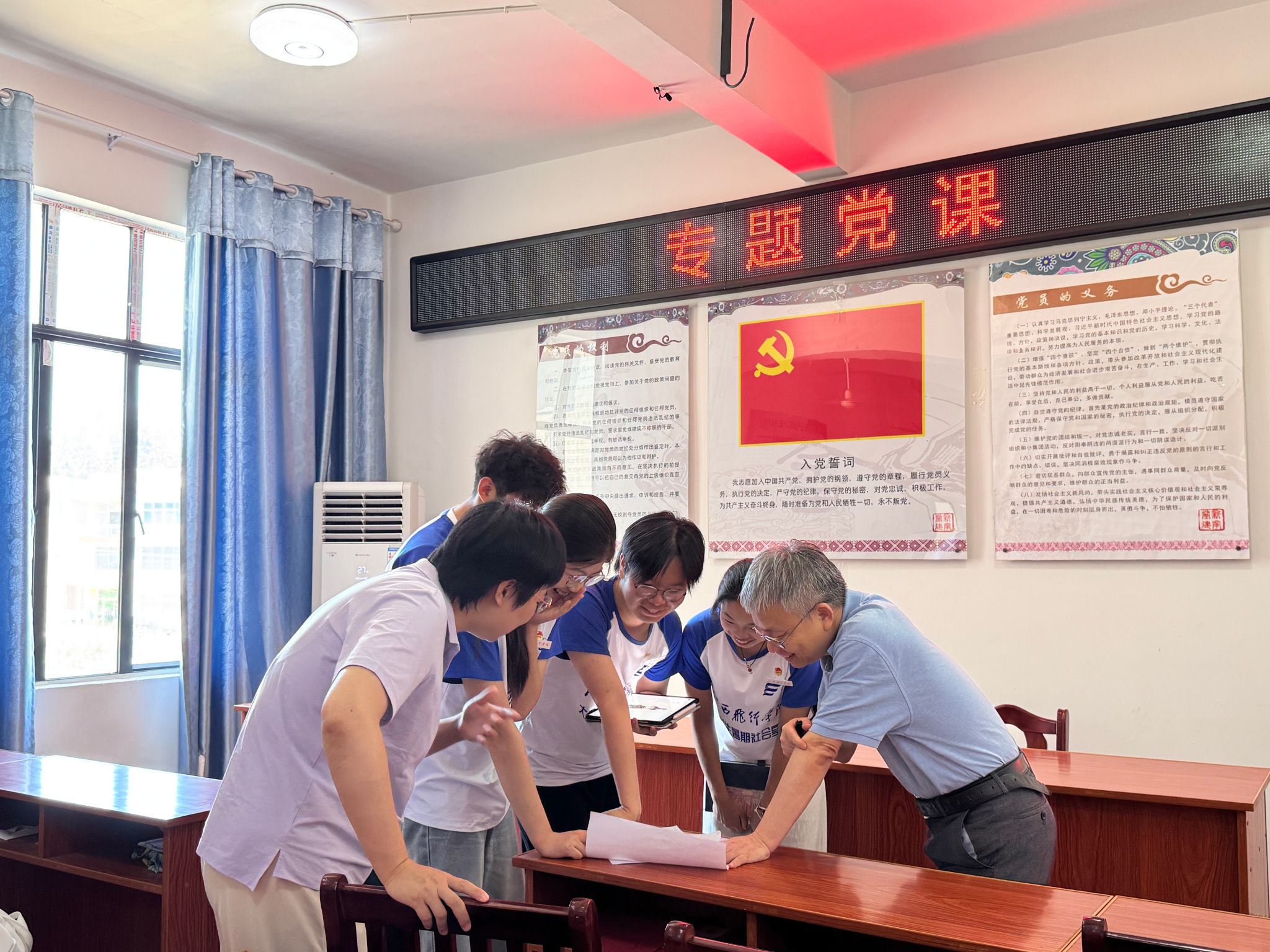 在村部会议室,唐勇与同学们座谈交流,听取同学们参加社会实践、志愿服务、体验畲族文化等方面的心得体会,并为学生现场讲授一堂《铸牢中华民族共同体意识》专题党课。