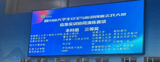 2025年11月1日,我院25级应急管理专业同学薛晨麟、先奕燃、刘志翔、谌霖、黄俊杰在指导老师卢意、胡颖的带领下,参加了由四川省教育厅主办的四川省大学生安全与应急创新实践大赛。同学们在决赛中面对来自全国近百所高校的优秀选手,沉着应对、团结协作,凭借扎实的专业知识、规范的操作技能和出色的临场发挥,最终荣获三等奖,为学校赢得了荣誉。
