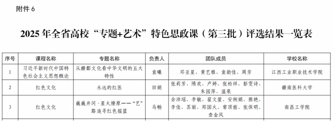 近日,江西省教育厅公布了2025年全省“大思政课”建设综合改革试验区改革项目评选结果。经学校推荐、教育厅审核、专家评审及公示等环节严格遴选,我校《红色文化》“一课多师”教学团队教师凌阿妮主持申报的“大讲台 红舞台---‘艺’述中国共产党能够在井冈山站稳脚跟的‘精神密码’”专题思政课程,荣获全省高校“专题+艺术”特色思政课。