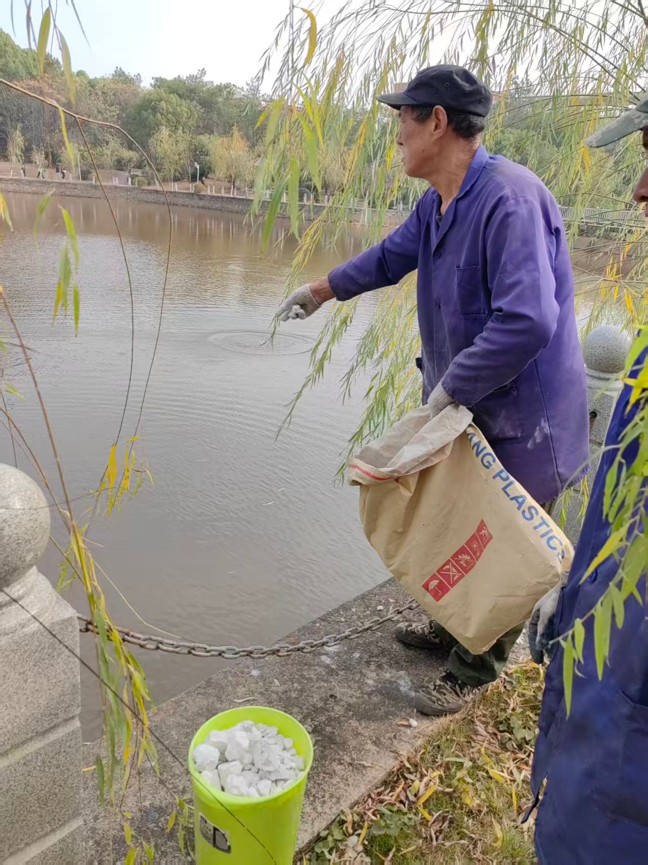 校园内的人工湖上游因长期没有降雨导致湖体干涸,水质浑浊。总务处安排将人工湖下游的湖水抽调至上游进行水量补充,并通过铺设石灰调节水质酸碱度,抑制有害微生物滋生。