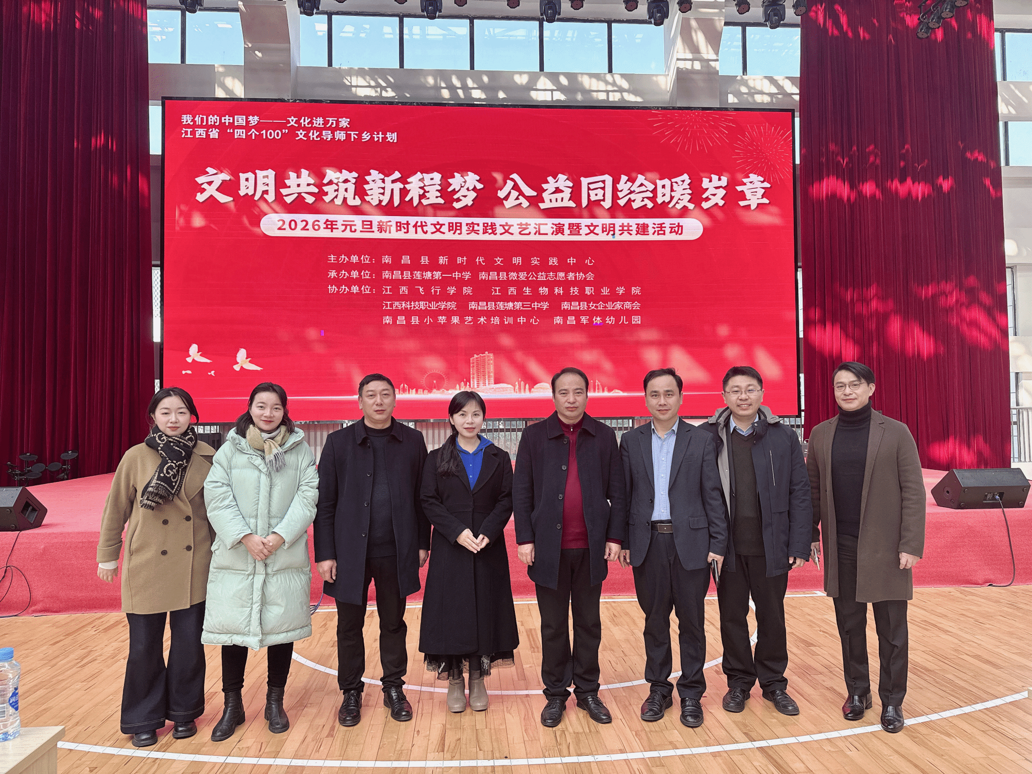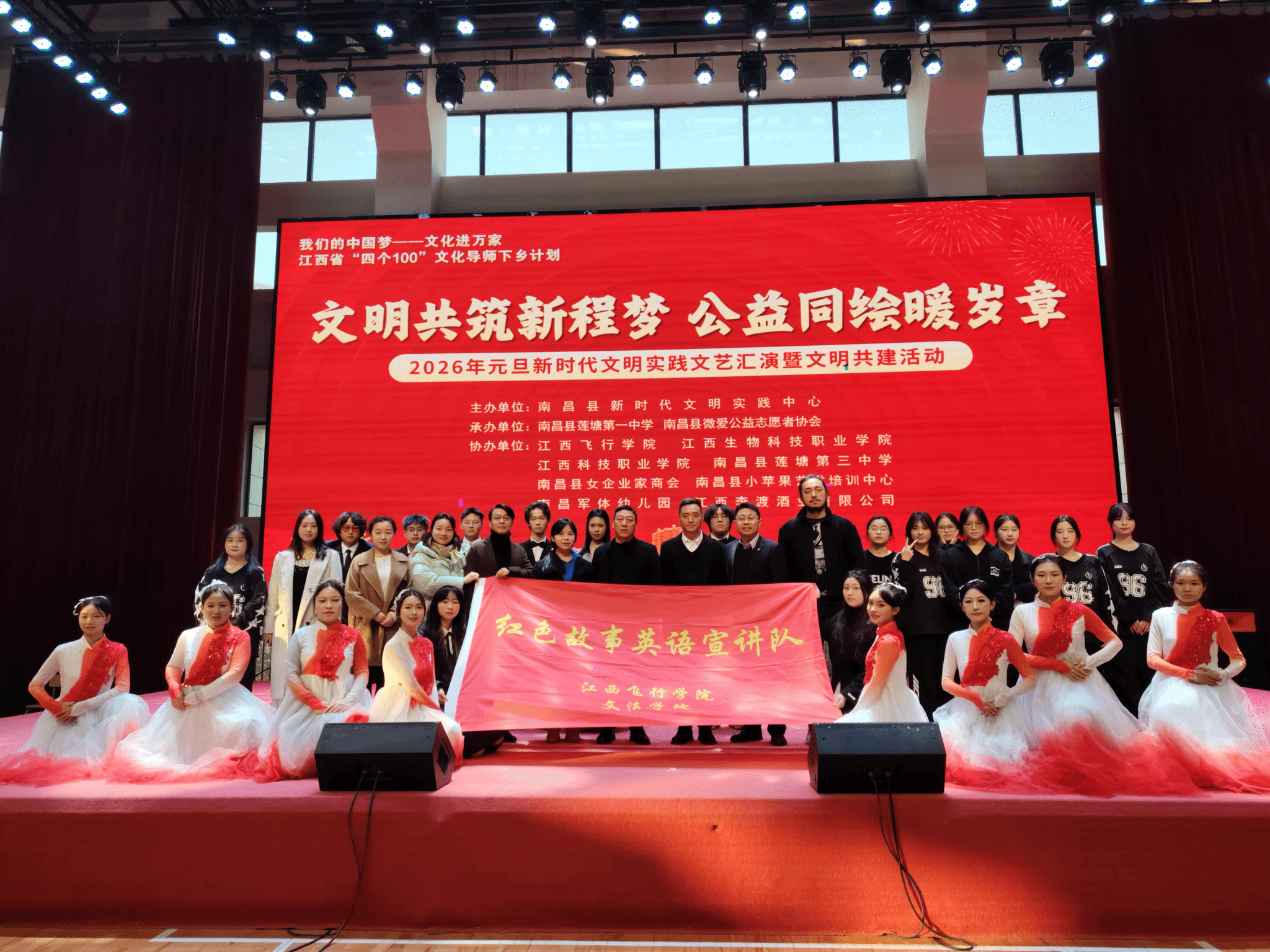 12月27日下午,2026年元旦新时代文明实践文艺汇演暨文明共建活动在南昌县莲塘第一中学举行。本次汇演以“文明共筑新程梦,公益共会暖岁章”为主题,由南昌县新时代文明实践中心主办,莲塘第一中学与南昌县微爱公益志愿者协会承办,江西飞行学院等多家单位共同协办。江西飞行学院文法学院院长林芸带队,组织社团代表、红色故事英语宣讲队及红色班级师生参加了演出。