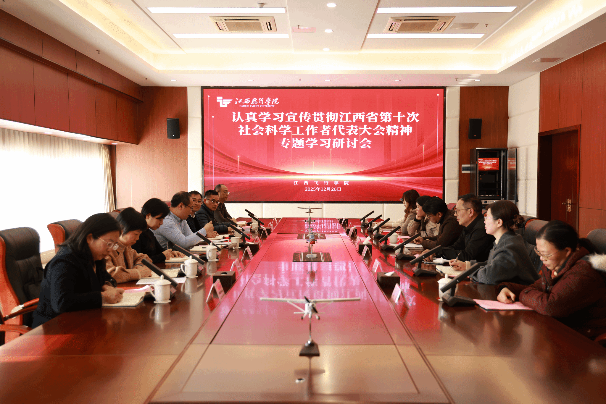 2025年12月26日下午,江西飞行学院社科联在培训楼三楼会议室召开专题学习研讨会,深入学习领会江西省第十次社会科学工作者代表大会精神。校党委委员、副校长、校社科联主席郭军华出席会议并讲话。校党委委员、宣传部部长、校社科联副主席李方明,科研处副处长、校社科联秘书长雷芳,以及相关学院、研究机构负责人和社科工作者代表参加会议。会议由校社科联秘书长雷芳主持。