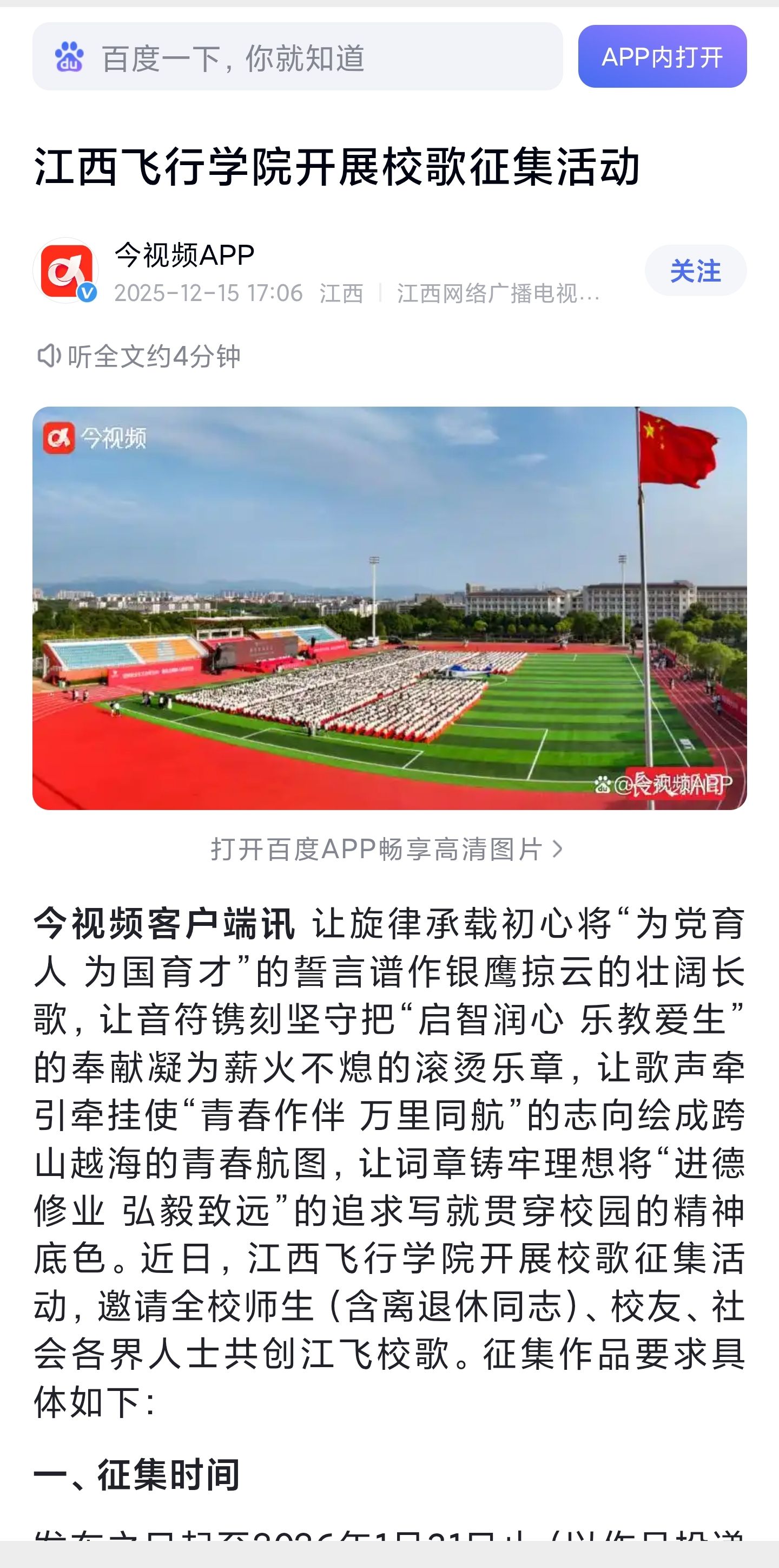 近日,百度网报道,江西飞行学院开展校歌征集活动详情如下: