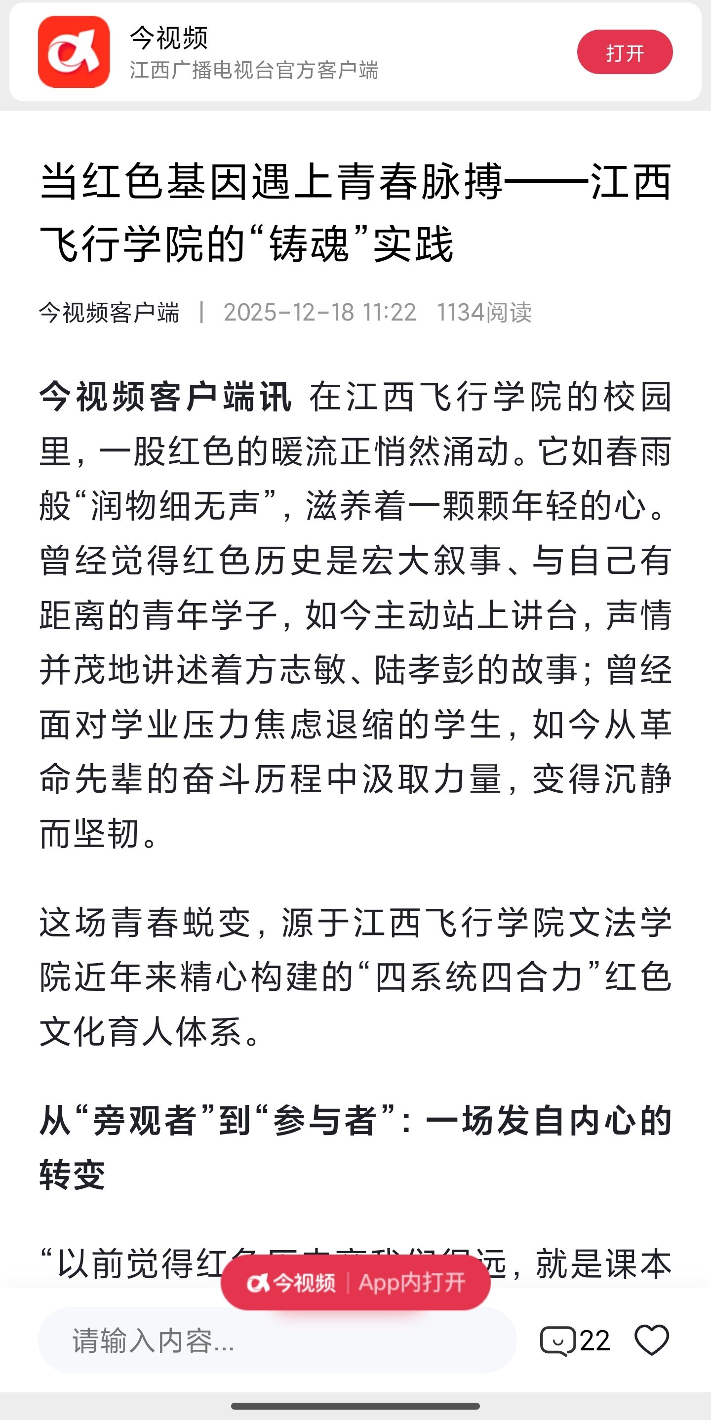 近日,今视频道,江西飞行学院开展当红色基因遇上青春脉搏——江西飞行学院的“铸魂”实践详情如下